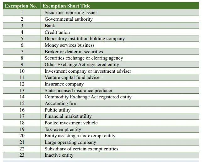 在CTA下,有23种可豁免的情况,其中包括已上市公司(因为它们已按要求披露最终受益人信息)、银行和金融机构、投资公司、保险公司、政府实体以及公用事业实体、非营利组织和其他免税机构等。此外,还有一种「大型营运企业」(Large Operating Company)的豁免,满足该豁免的企业需符合以下条件:1. 每年营收超过5百万美元;