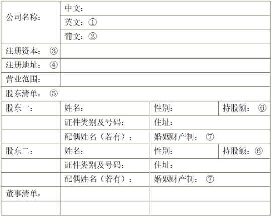 3. 公司名称可以仅为中文或仅为葡文,根据商法典的规定,若要加英文,则需要中英葡三语,客户只需提供中英文即可,葡文由我们翻译;
